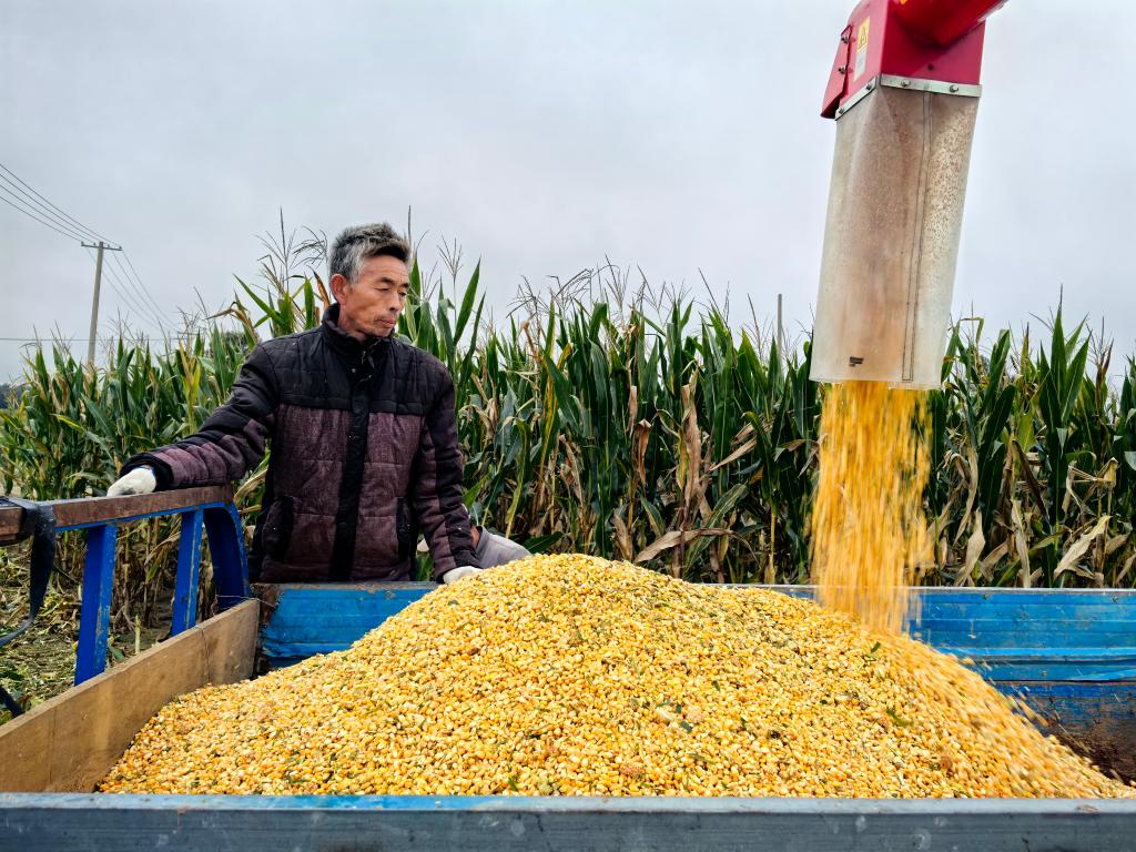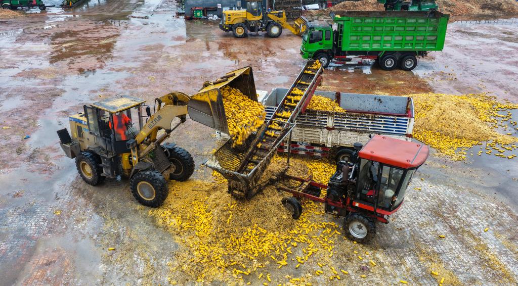 工做人员正在拆运玉米进行脱粒(无人机照片)。”豆田里,(记者叶婧、高天)秋天清晨,